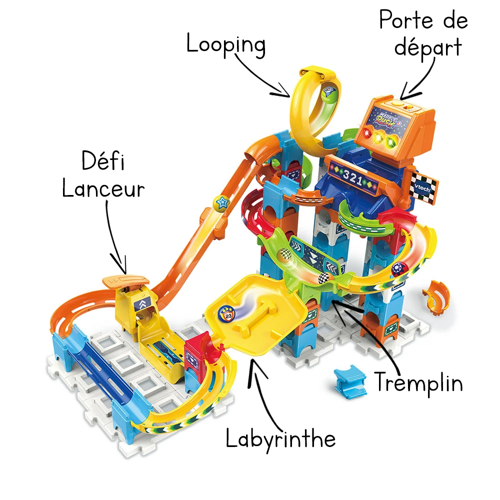 - Challenges : Le lanceur propulse les MarbleBilles à travers le circuit ! Votre enfant peut rivaliser avec ses copains ou sa famille sur des défis sans limites !