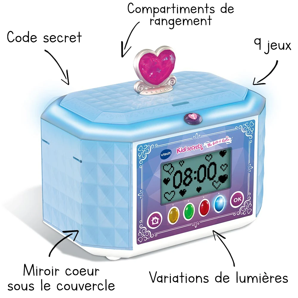 Cette merveilleuse boîte à bijoux contient un réveil, une horloge parlante, des jeux et sert aussi d’enceinte musicale pour écouter des chansons ou des mélodies incluses dans la boîte à bijoux.