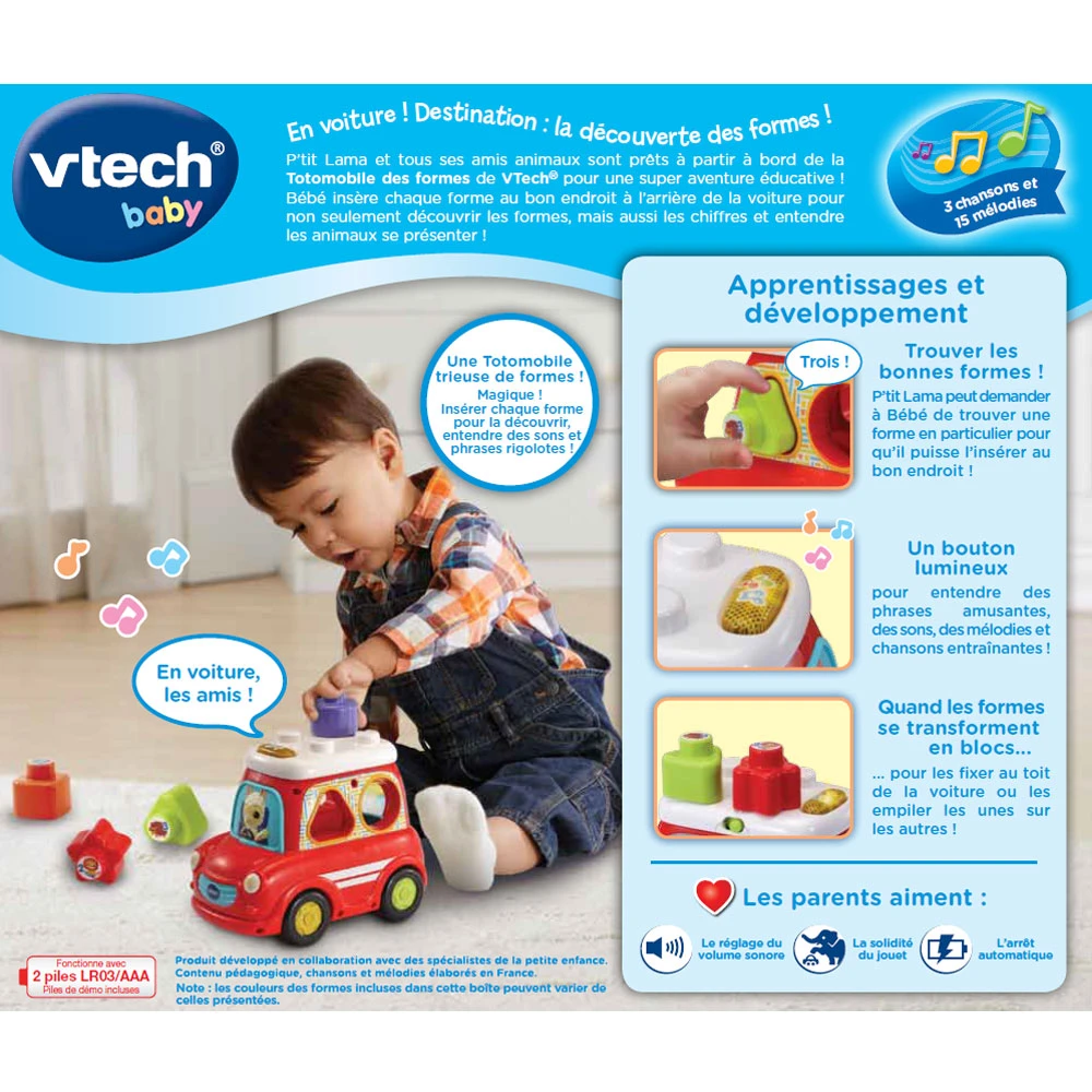 P’tit Lama et tous ses amis animaux sont prêts à partir à bord de la Totomobile des formes pour une super aventure éducative ! Bébé insère chaque forme au bon endroit à l’arrière de la voiture pour non seulement découvrir les formes, mais aussi les chiffres et entendre les animaux se présenter !