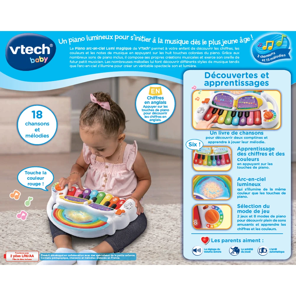 Le Piano arc-en-ciel Lumi magique permet à votre enfant de découvrir les chiffres, les couleurs et les notes de musique en appuyant sur les huit touches colorées du piano. Grâce aux nombreux sons de piano inclus, il compose ses propres créations musicales et exerce son oreille de futur petit musicien. Les nombreuses mélodies lui font découvrir différents styles de musique tandis que l’arc-en-ciel s’illumine pour créer un véritable spectacle son et lumière.