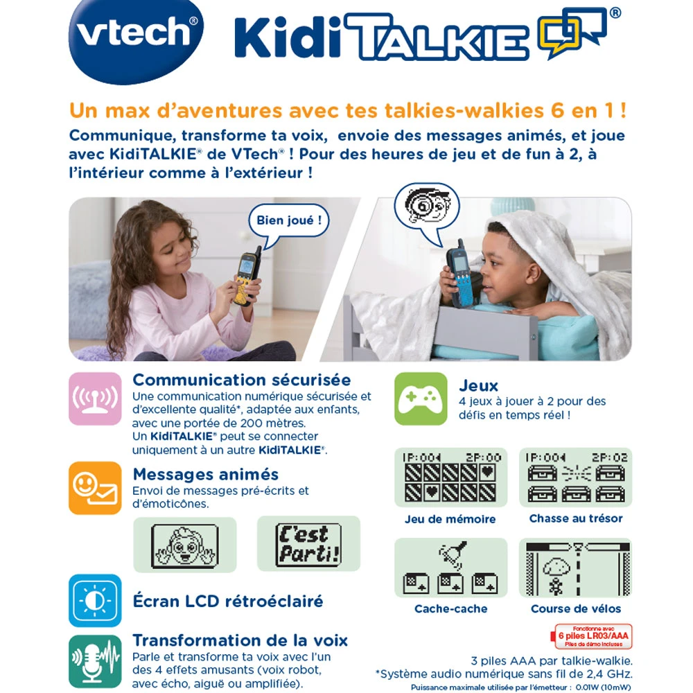 Découvrez les talkies-walkies VTech : en plus de la fonction de base, ces talkies walkies pour enfants intègrent des jeux, des effets de transformation de voix, des messages animés à envoyer par écran interposé…Bien plus que des talkies walkies !