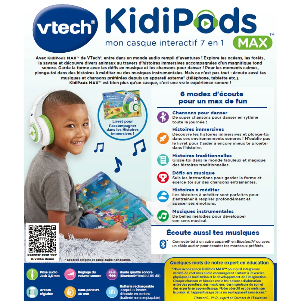 KidiPods MAX est un casque audio pour enfant , qui permet d’écouter plus de 3 heures de contenus inclus ou sa musique préférée grâce à la connexion Bluetooth ou MP3. Ce casque audio est confortable, solide, ajustable et spécialement conçu pour les enfants avec un volume limité à 85 db pour préserver l’audition. L’accès aux contenus intégrés est facile grâce au sélecteur de mode sur le côté du casque.