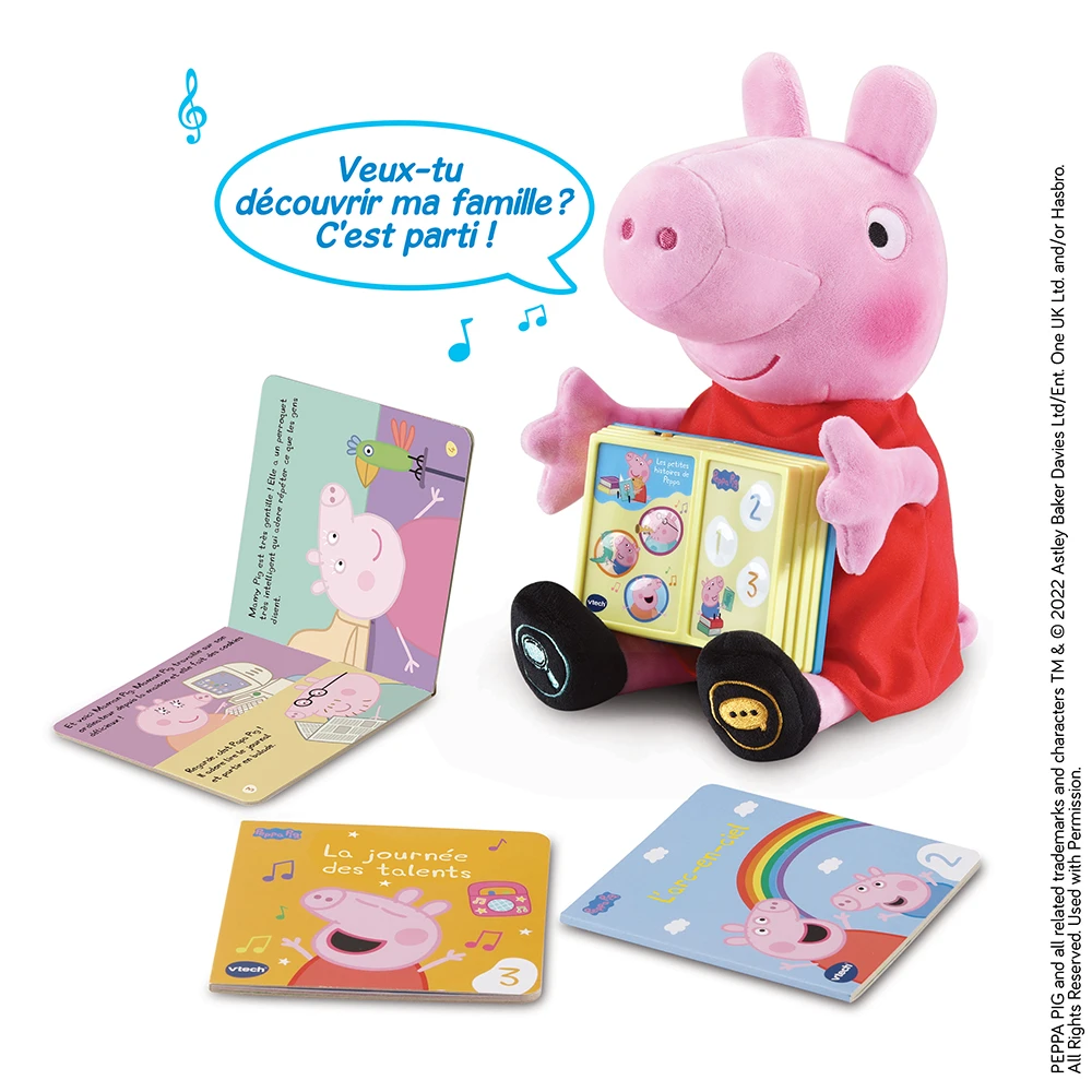Avec cette peluche interactive et ses 3 livres inclus, votre enfant découvre l’univers de Peppa Pig grâce aux histoires que raconte Peppa sur les membres de sa famille, leurs couleurs préférées ou la journée des talents à l’école.